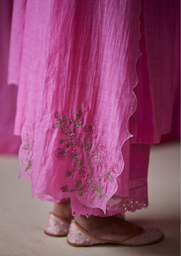 The Gul Odhni in handwoven chanderi features a scalloped edge with our signature scallops inspired by Mughal arches. Dainty rose blooms are embroidered along the four corners.