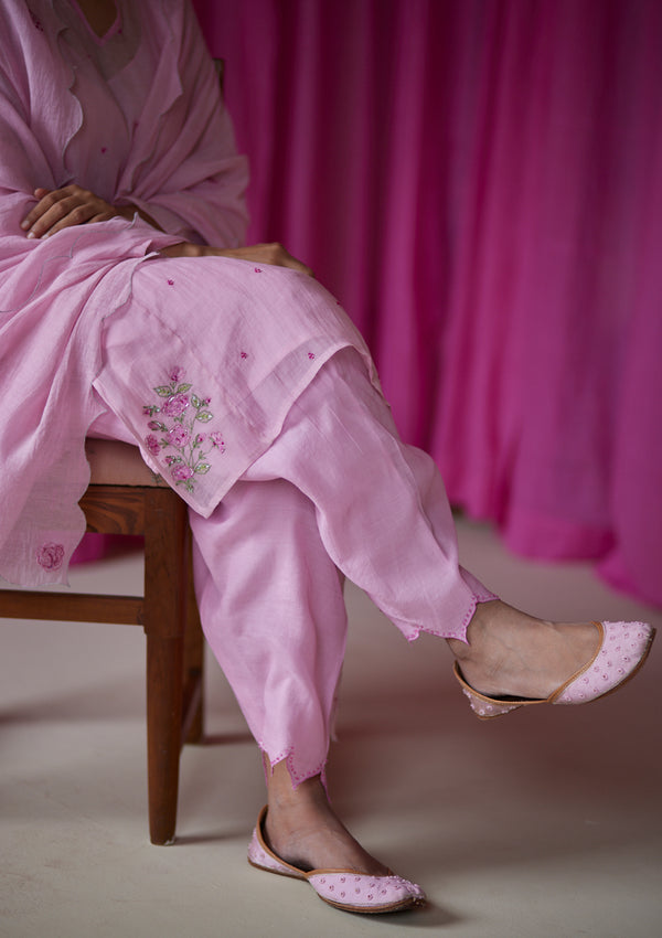 The Gulrukh Odhni in handwoven chanderi features a scalloped edge with our signature scallops inspired by Mughal arches. Dainty hand embroidered rose blooms are scatter all over the odhni.