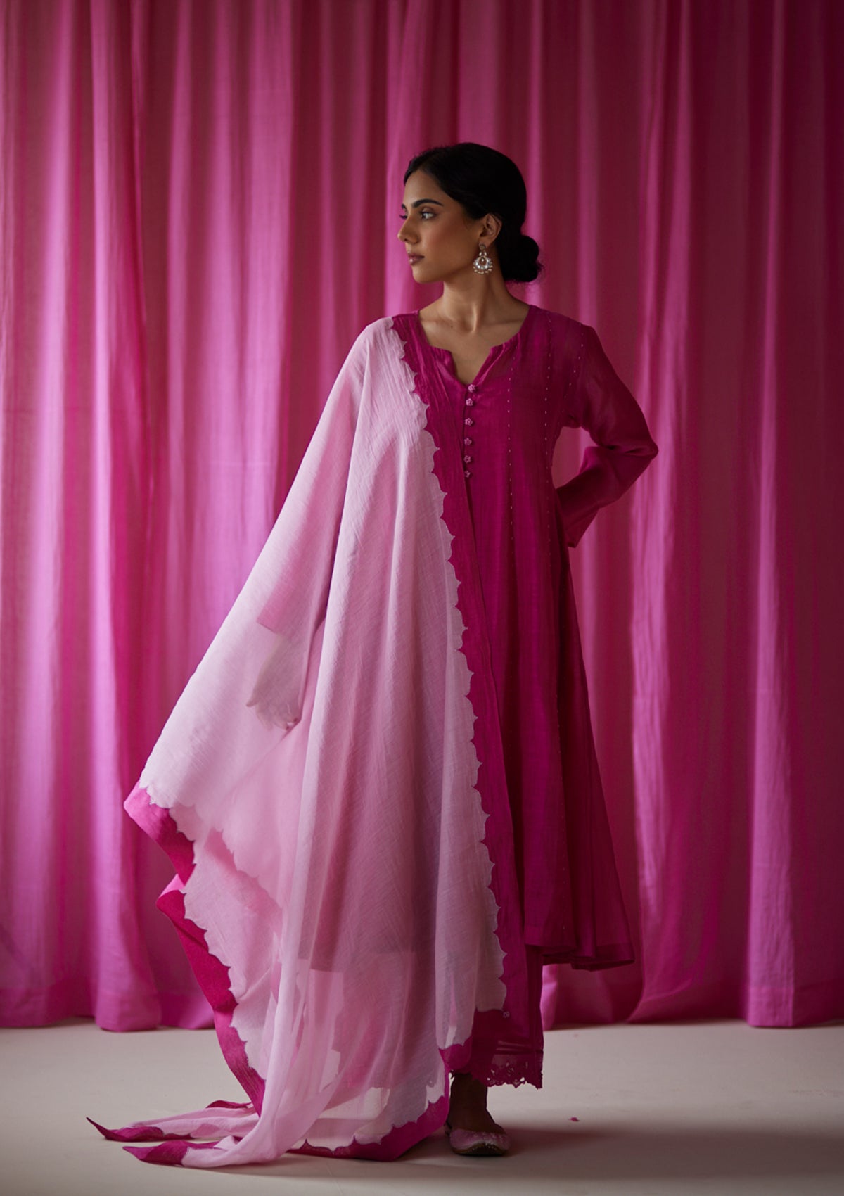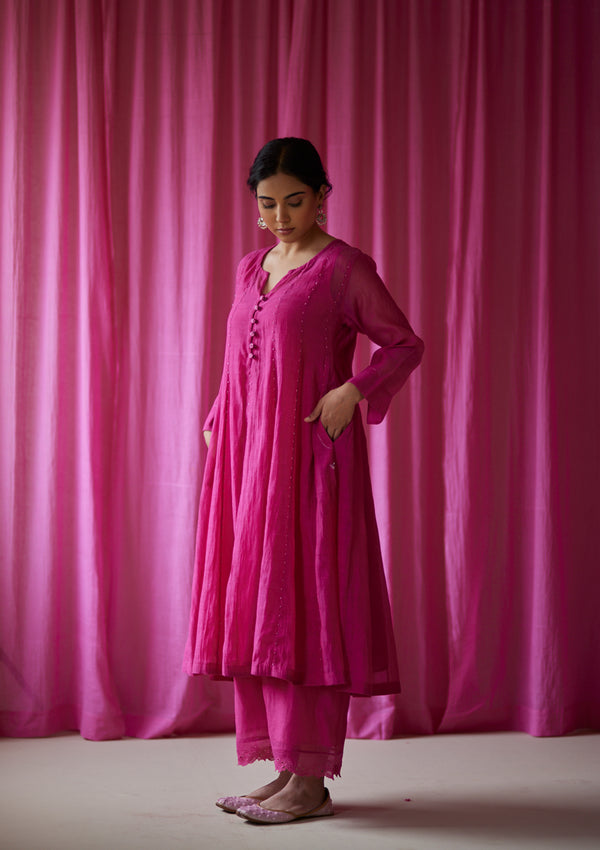 Inspired by Royal Mughal silhouettes, the Gulzar Anarkali is cut and tailored in panels of handwoven chanderi, each panel highlighted with hand done bead embroidery. Handmade beaded buttons dot the bodice. The anarkali is paired with the matching Gulzar pants with hand-done cutwork.