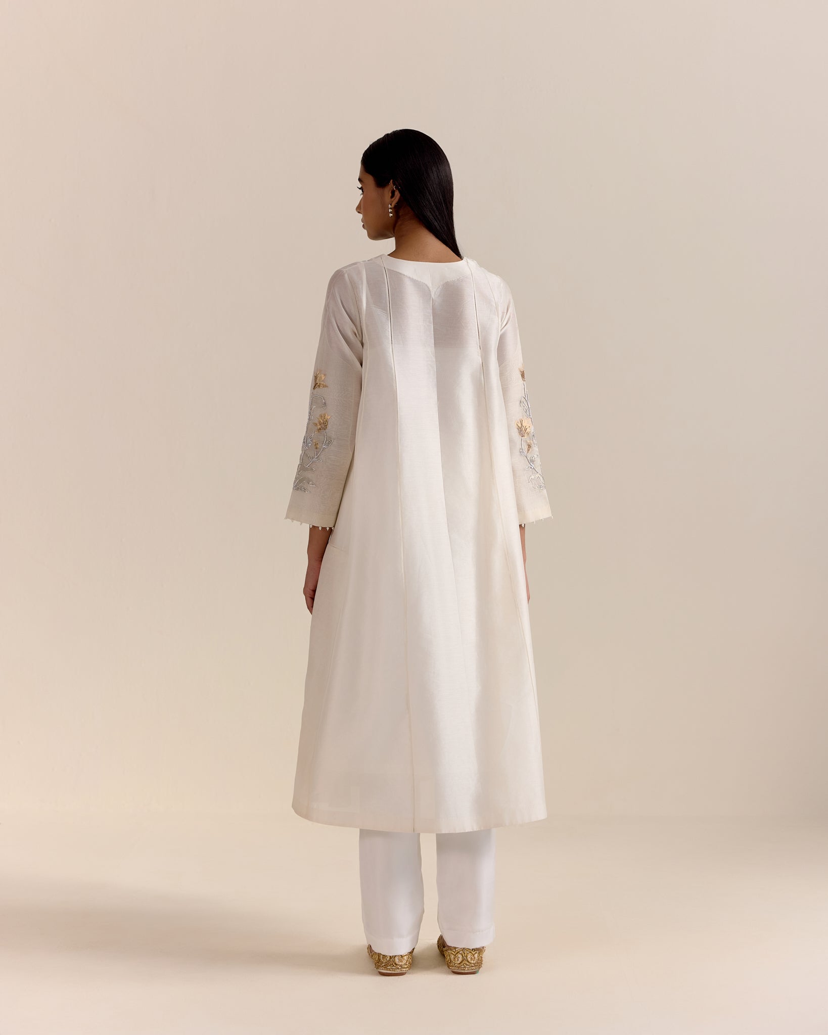 Includes: Kurta, mulmul slip and pants Fabric: Handwoven chanderi and silk Colour: Pearl White Fit: Relaxed Fit Care: Dry clean only, no sprays of any kind, store in a cotton garment bag