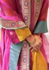 The Jamuni Odhni is crafted in wispy organza, finished with a heritage handwoven zari and meenakari border and contrasting piping.