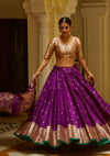 The Jamuni Tehvaar Lehenga in a vibrant tone of purple is handwoven in mulberry silk and gold plated zari by our artisans in Banaras and is decorated with bootis all over that are woven using the karhua weaving technique. The lehenga is paired with the Jamuni Jashn Blouse in handwoven silk brocade and a royal shikargah odhni in mulberry silk and gold plated zari, handwoven using the karhua weaving technique.