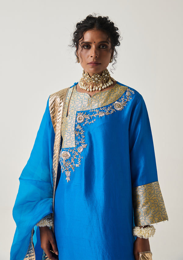 Inspired by traditional Mughal silhouettes, the Jannat Neelambari Kurta, tailored in pure silk features a keyhole detail along the neckline. The sleeves and necline feature panels of handwoven silk kimkhwab woven by our artisans in Banaras in mulberry silk and gold plated zari in a jaal inspired by art deco floral motifs. Museum quality heritage hand embroidery in dabka, zardozi and pearls completes the kurta.
