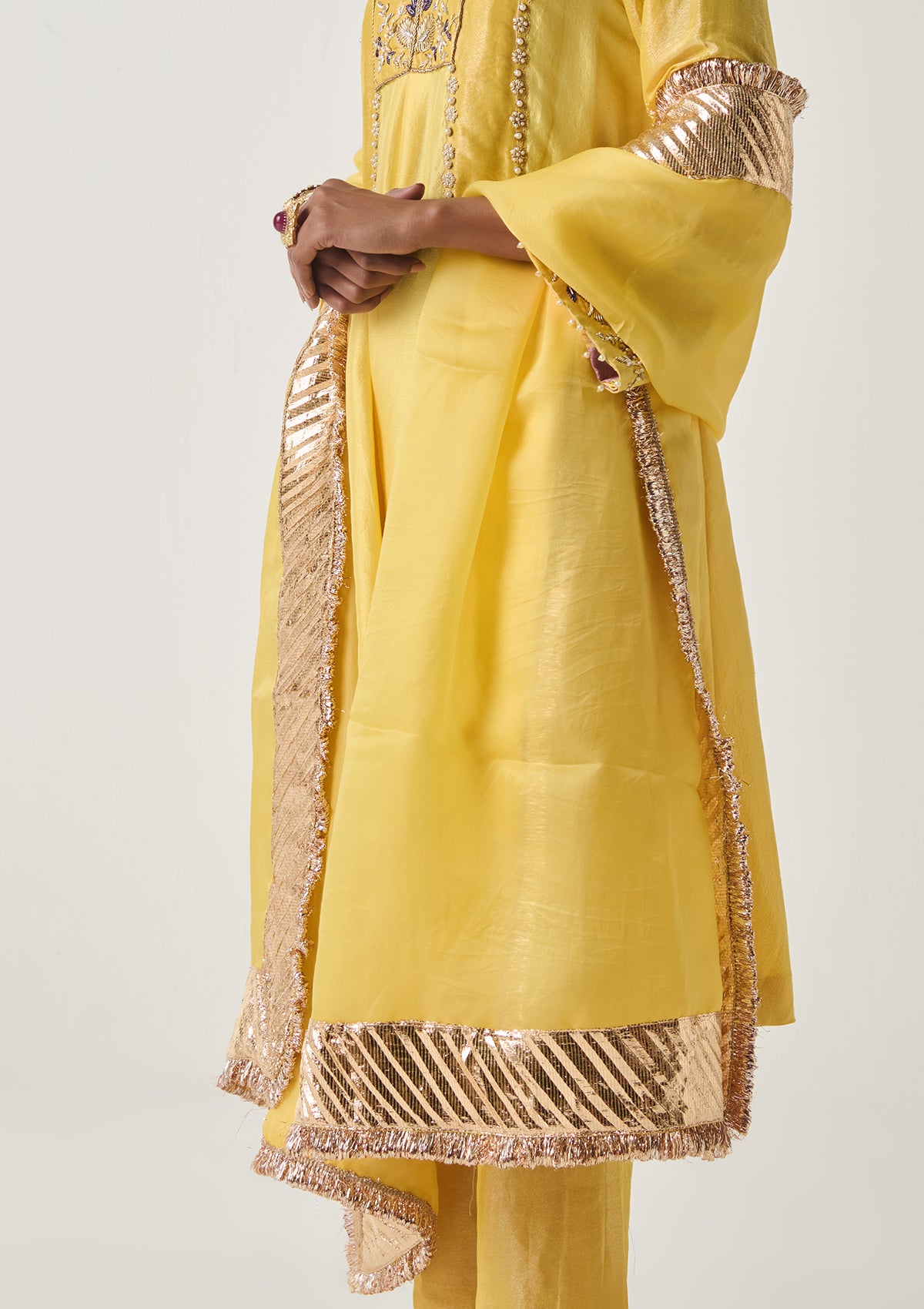 The Khayaal Nargis Organza Odhni is made in the softest, breezy silk organza. The borders are decorated with rich metal gota and a metal kiran (fringe) that lend it a regal feel.
