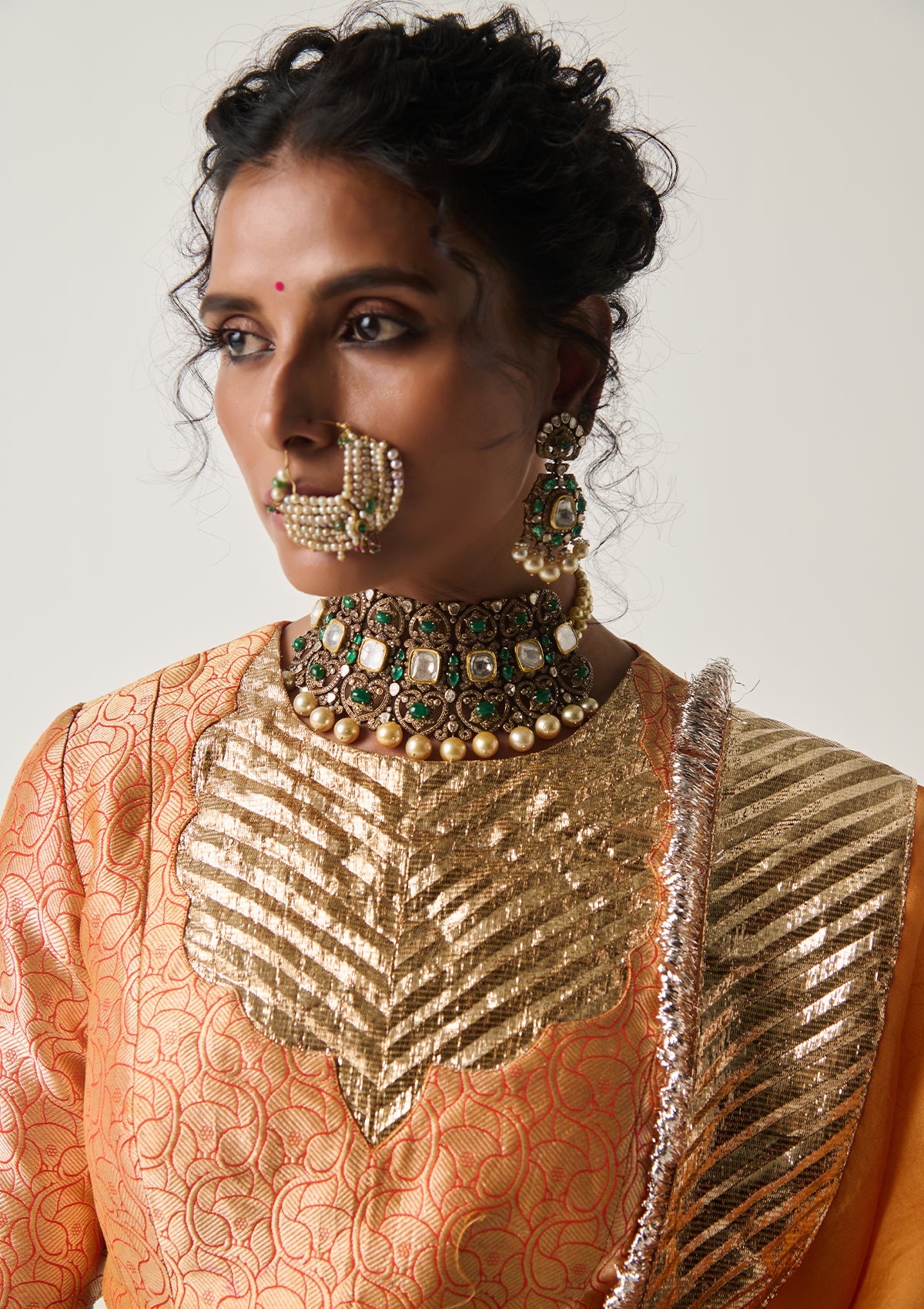The rich and regal Khwaab Narangi Kimkhwab Blouse is tailored in the finest handwoven kimkhab brocade. The Kimkhwab is expertly woven by our artisans in banaras in mulberry silk and gold plated zari in a weave inspired by Art Deco motifs. The yoke of the blouse features a contrasting panel of metal gota cut in a shape inspired by Mughal arches.