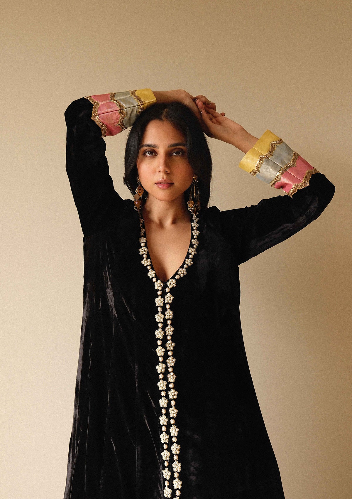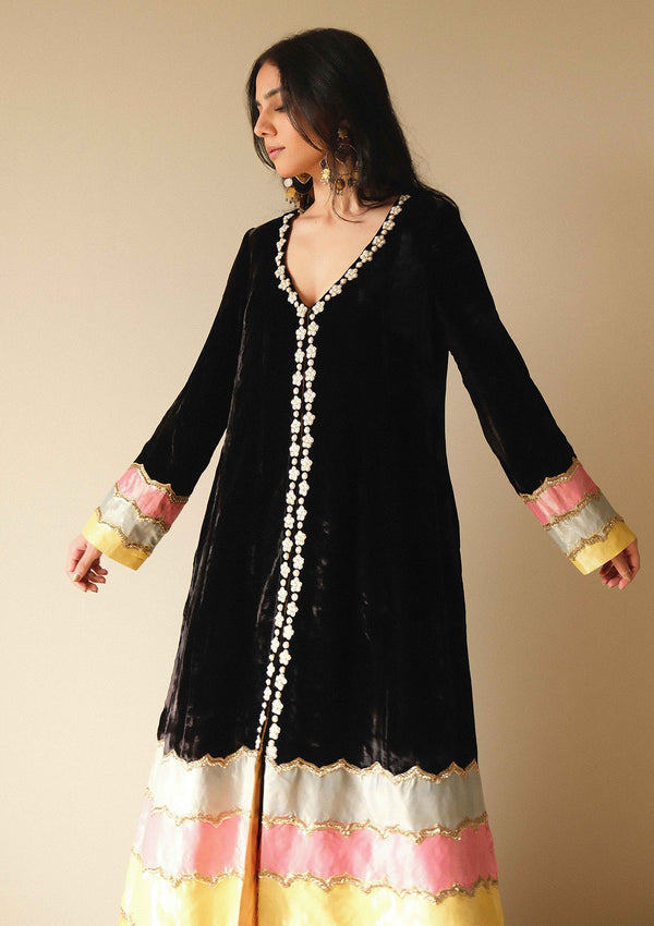 The Kohinoor Surma Velvet Kurta is tailored in the finest silk velvet with contrasting panels of handwoven silk tissue in vibrant sorbet hues. The silk tissue panels and front of the kurta are decorated with floral motifs in museum quality dabka and zardozi hand embroidery.