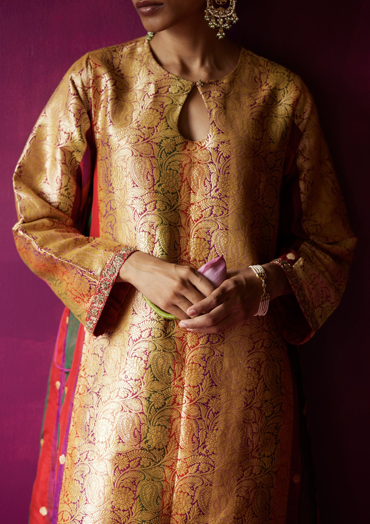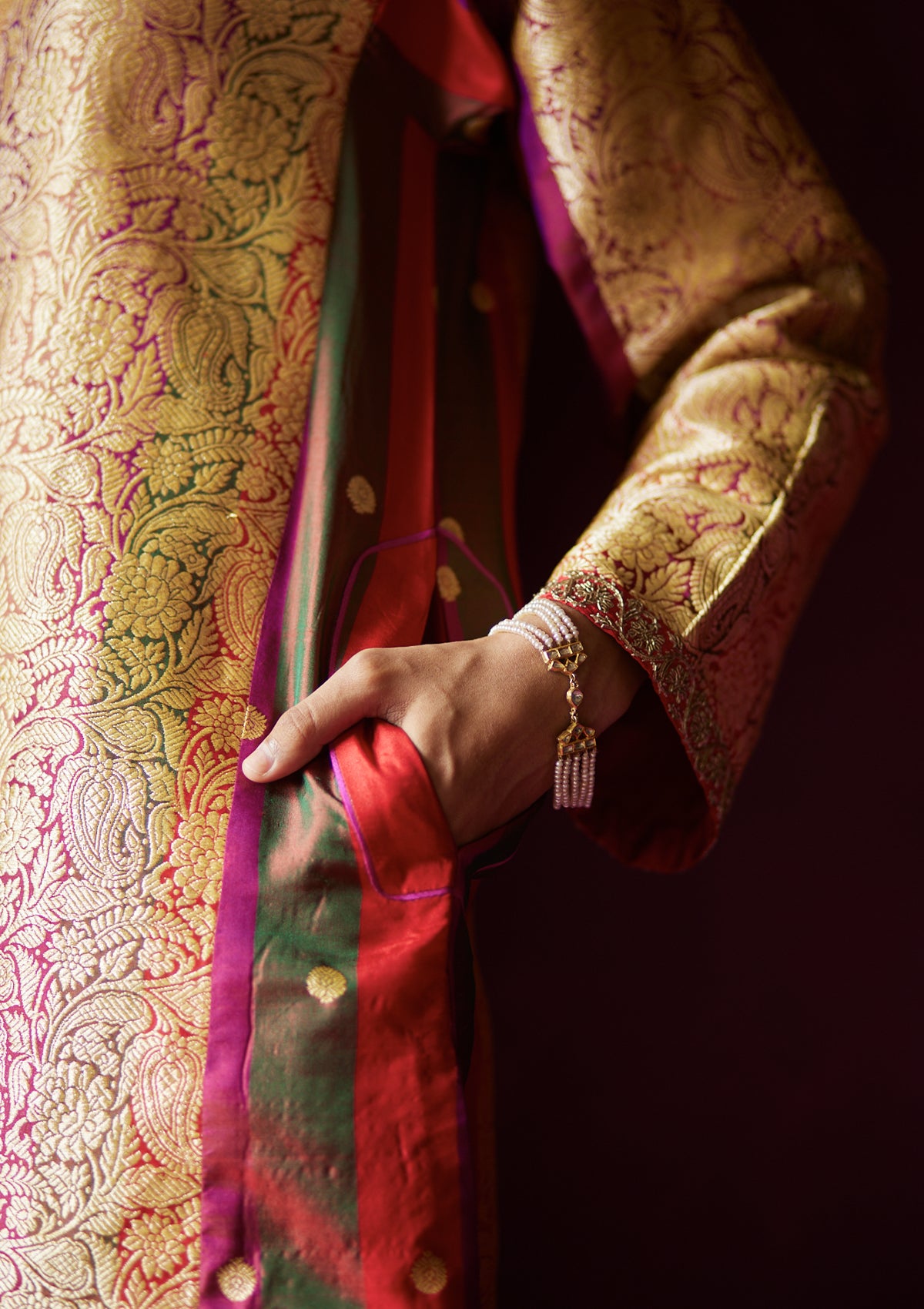 The Pachranga Mahboob Brocade Kurta is tailored in the finest handwoven Kimkhwab Brocade. The design of the brocade is revived from a 19th century weave that was created for a Rajput wedding but never used. The floral and paisley jaal was recreated in gold plated zari on a surface of our signature pachranga silk, that uses five different hues of silk yarn. The kurta is complete with side panels of our signature handwoven pachranga silk, interspersed with gold plated zari bootis, and a handwoven zardozi border along the sleeves.