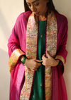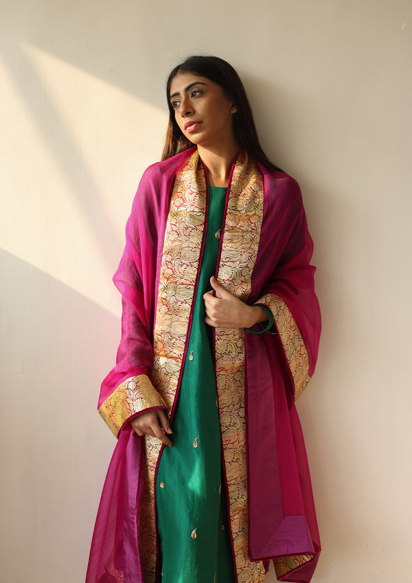 The Pachranga Mahboob Odhni in breezy silk organza is decorated with a border of the finest handwoven Kimkhwab Brocade. The design of the brocade is revived from a 19th century weave that was created for a Rajput wedding but never used. The floral and paisley jaal was recreated in gold plated zari on a surface of our signature pachranga silk, that uses five different hues of silk yarn. The festive dupatta pairs well with our kurtas and lehengas alike.