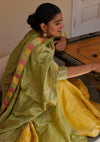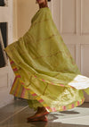 The Pista Tissue Odhni is created in soft handwoven silk tissue with delicate hand embroidered floral vines all across and is finished with a contrasting tiranga tissue back finish.