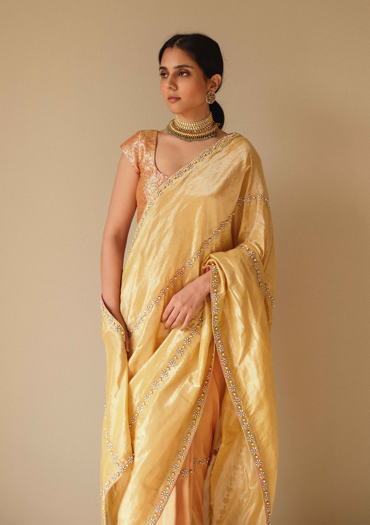 The Rafat Topaz Saree is crafted in luxurious silk in contrasting half and half panels of handwoven tissue in beige and pure silk in soft peach. The saree is decorated with borders in museum quality hand embroidery in dabka and pearls with contrasting handwoven pachranga silk tissue back finishings.