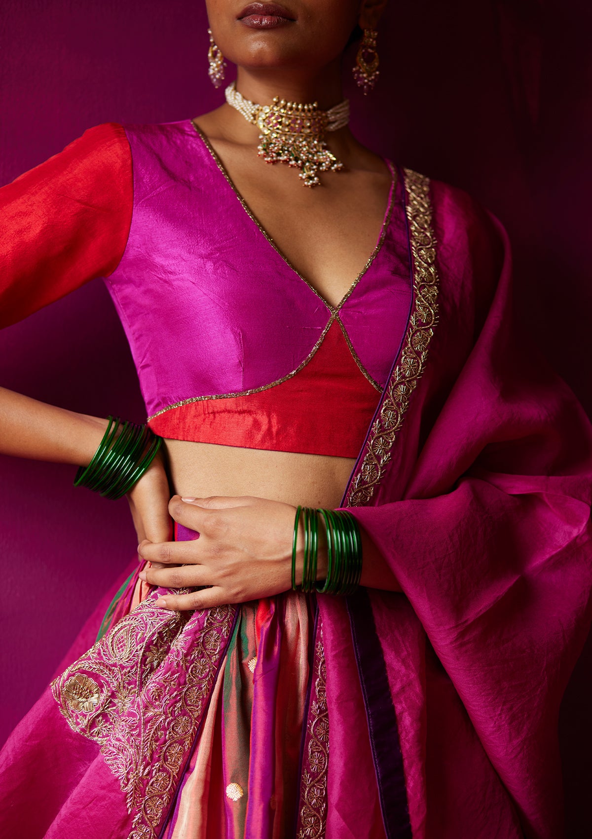 The Rani Chiran Odhni in breezy silk organza is delicately hand embroidered with dabka and zardozi work all along the border. The four corners are highlighted with hand embroidery floral vines. The festive dupatta pairs well with our kurtas and lehengas alike.
