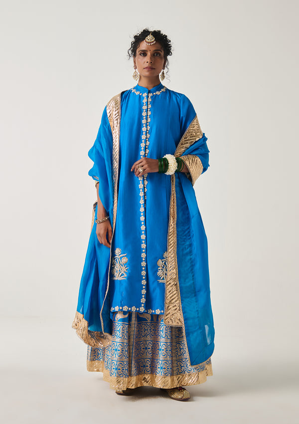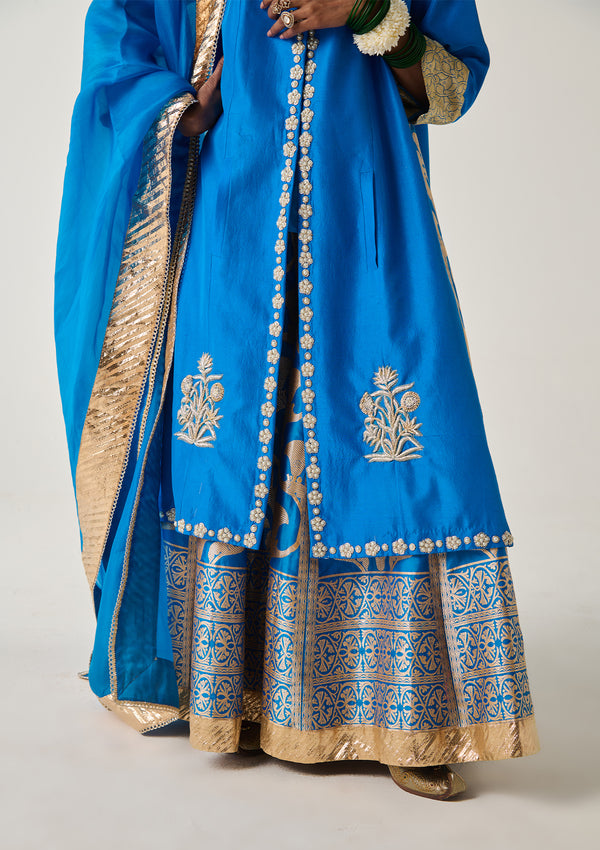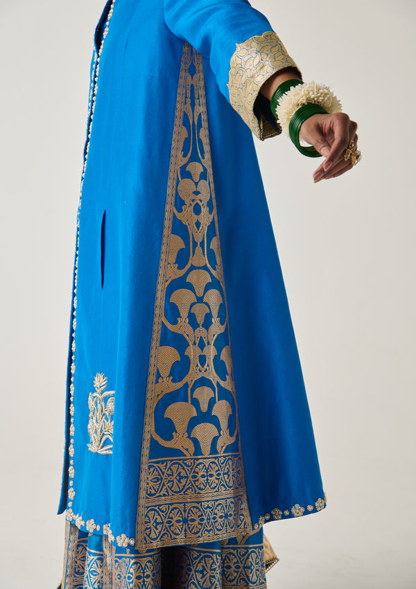 Pair the kurta with the Zohra Brocade Sharara handwoven in silk and gold-plated zari in kalis inspired by Art Deco floral motifs, finished with a metal gota border, and a matching organza odhni decorated with a gota border.