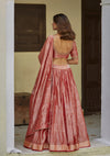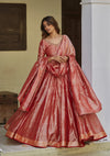 The Sindoori Jashn Lehenga is a graceful silhouette, tailored to perfection in glistening folds of handwoven silk tissue. The lehenga is paired with the Sindoori Blouse in handwoven silk tissue featuring dabka and zardozi hand embroidery borders along the neckline and sleeves and the Sindoori Jalsa Odhni in silk tissue with booti zardozi and dabka hand embroidery all over.