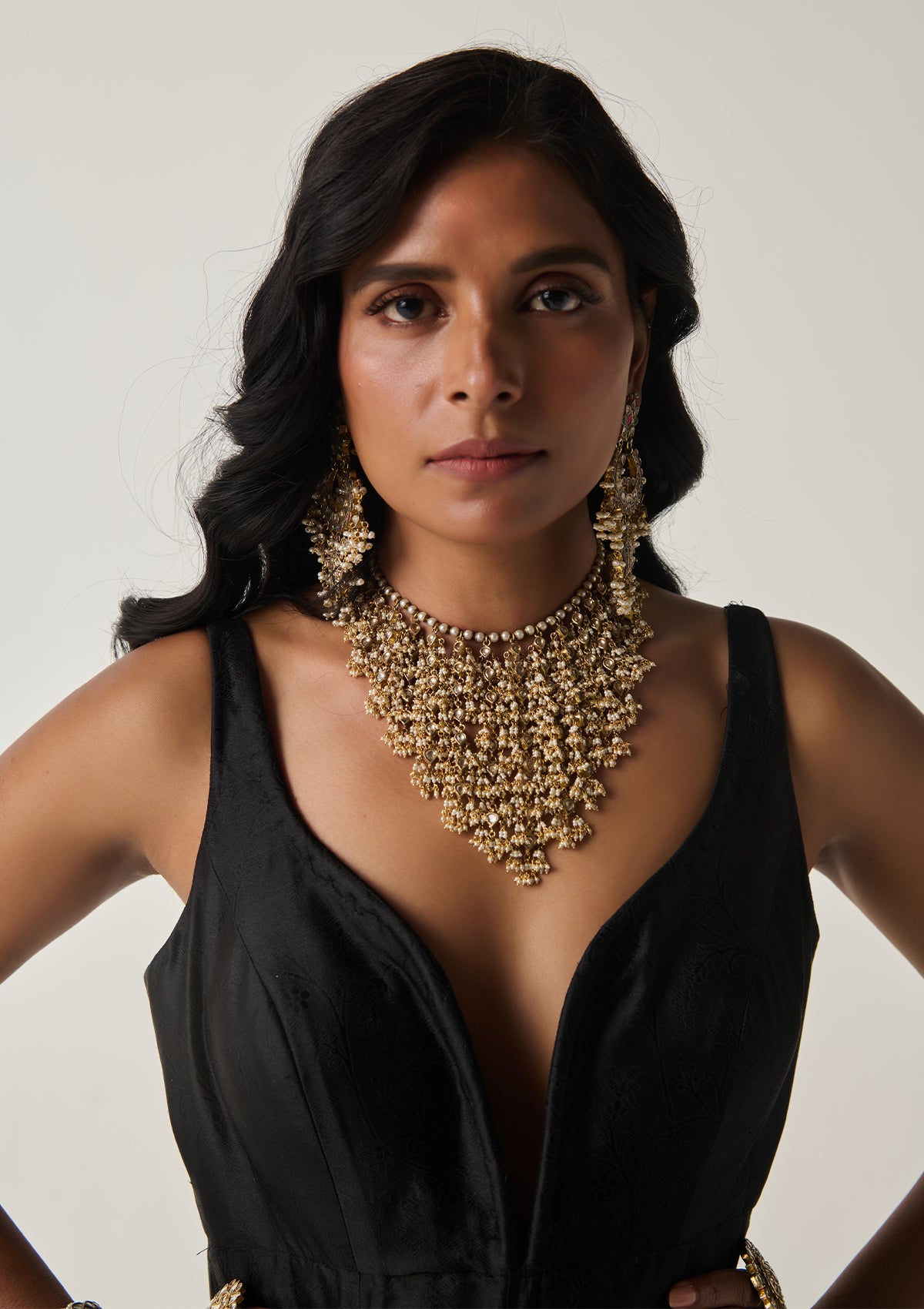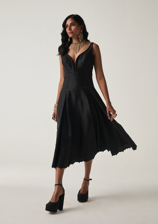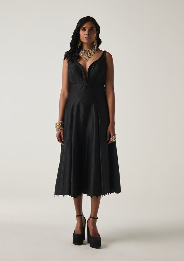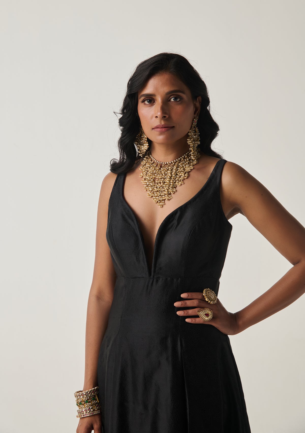 The Fareeha Surma Tara Dress is tailored in fine tanchoi fabric, handwoven over months by our artisans in Banaras in pure silk with a tone on tone floral jaal. The corset-like bodice is finished with a quilted inner lining. The hemline of the dress features a handcut scalloped border inspired by Mughal arches.