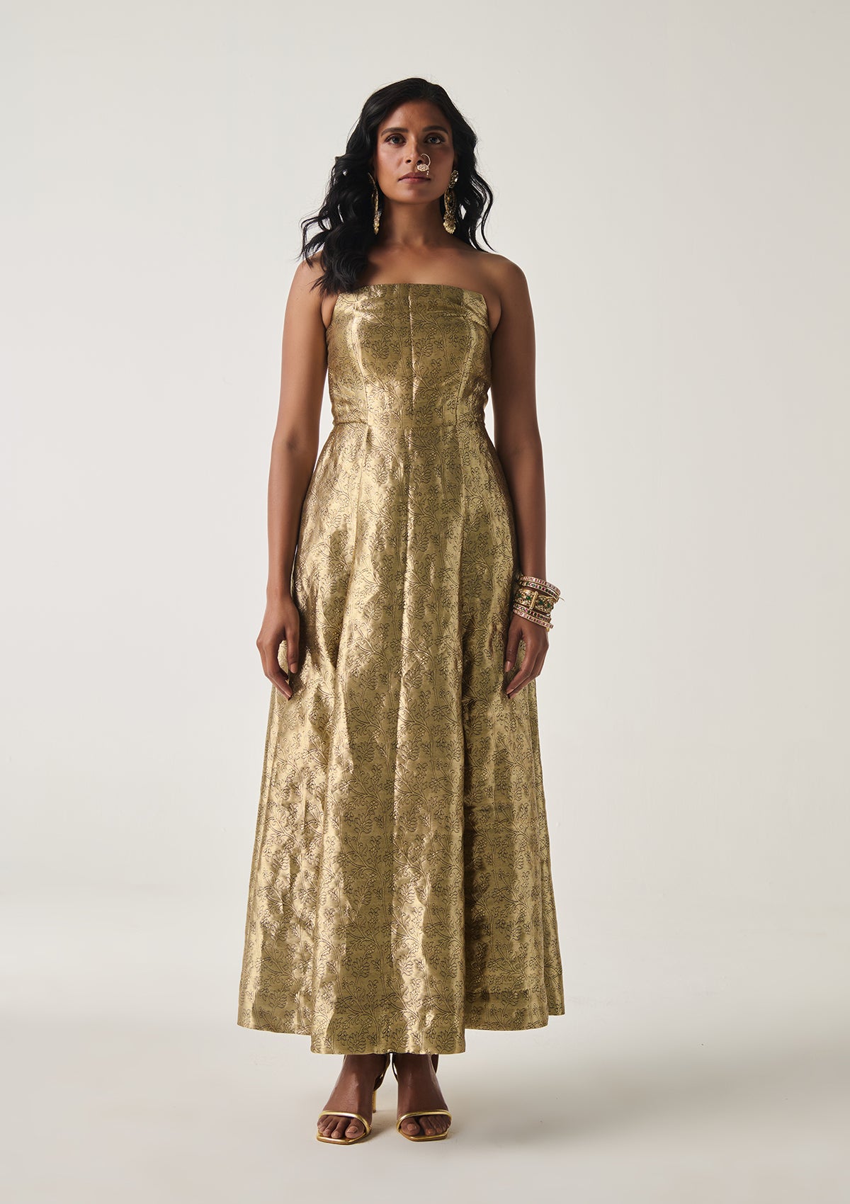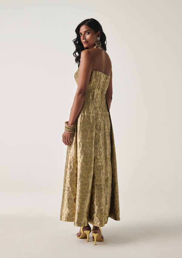 The Zohra Kimkhwab Dress is crafted in the most regal handwoven silk brocade created by our artisans in Banaras in pure silk and gold plated zari in an intricate floral jaal pattern. The corset bodice flows into a skirt cut into panels for the just the right flare.